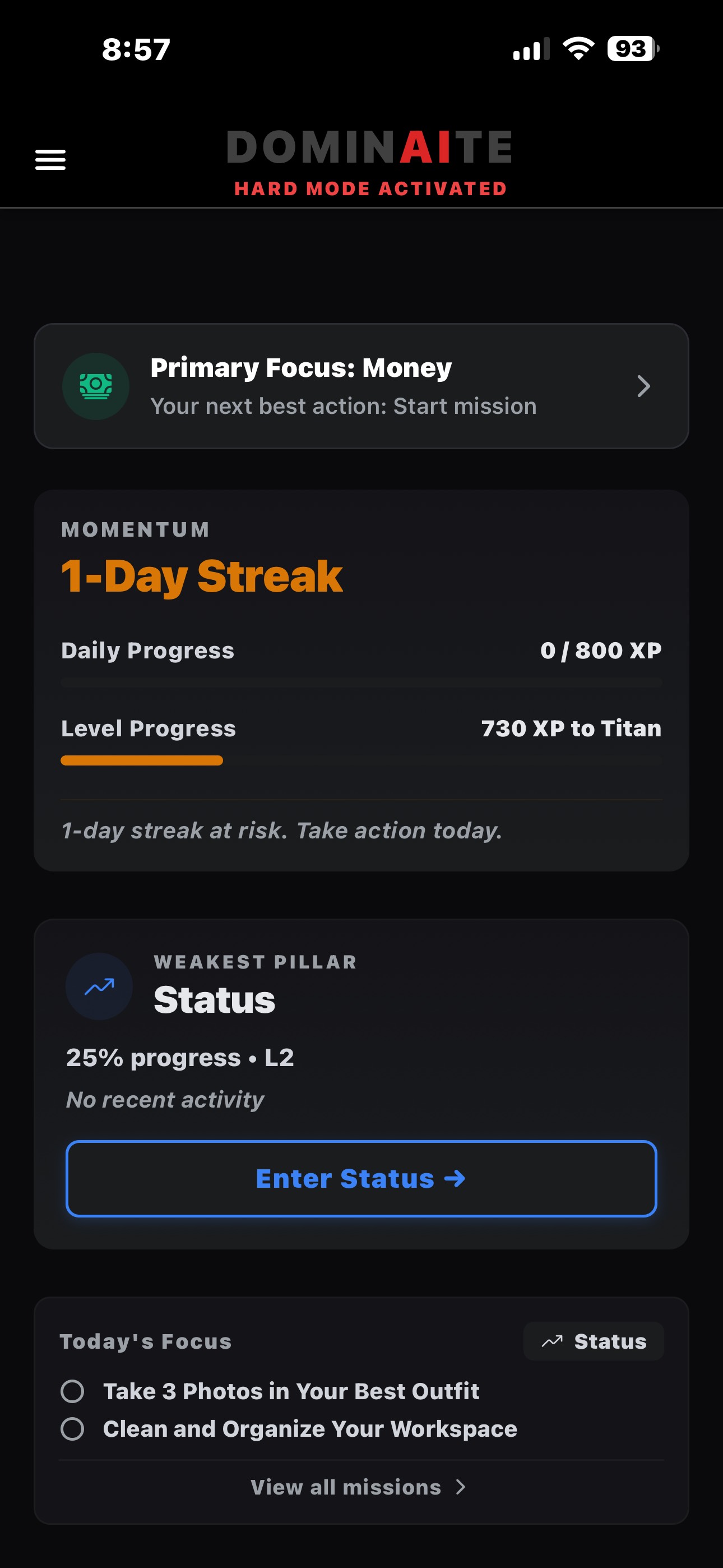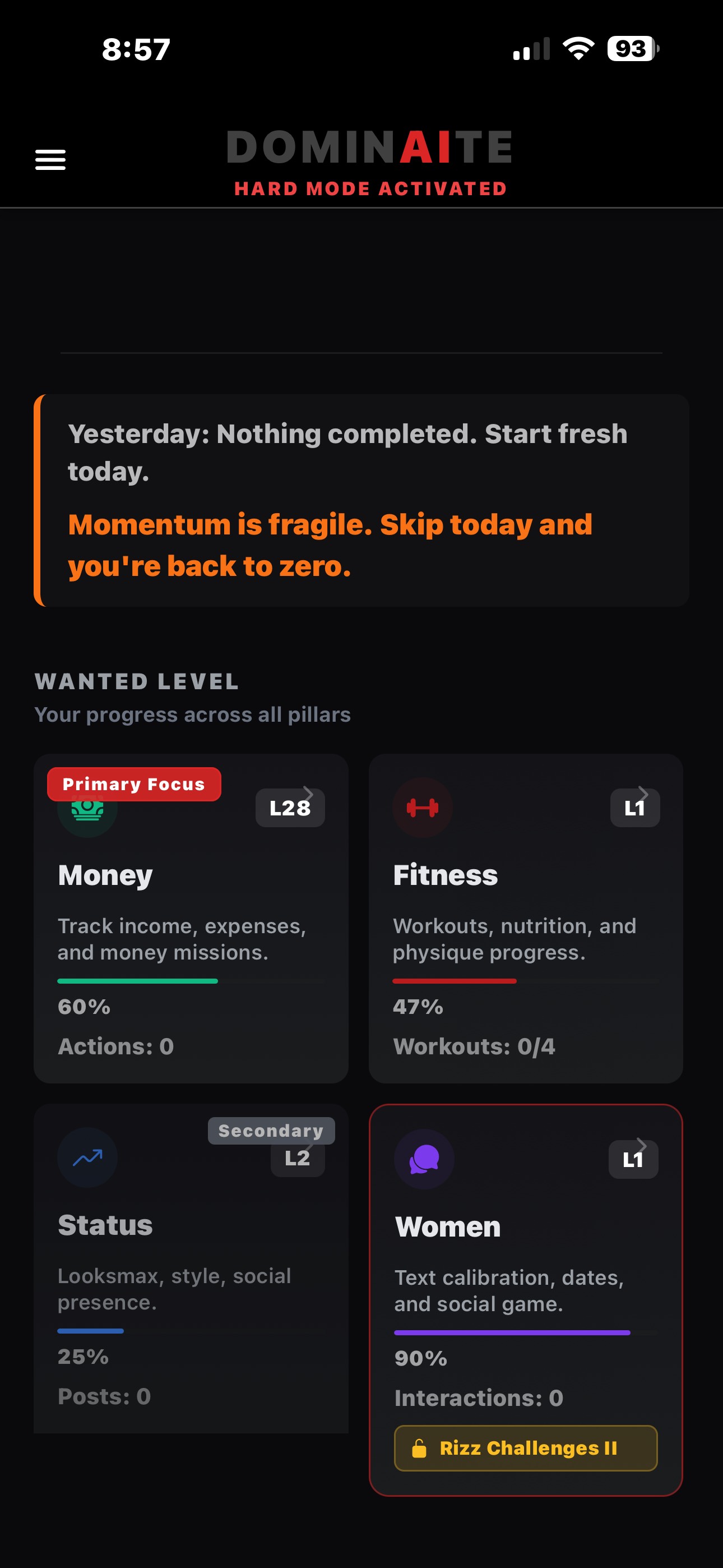 The self-improvement game that makes discipline addictive.Level up Strength, Wealth, Presence, and Women through daily missions, XP, and Hard Mode challenges.